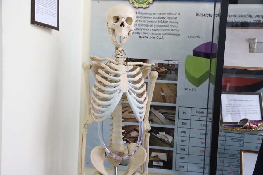 Другу позицію в контрабандному рейтингу впевнено займають наркотичні засоби. Для великих партій знову ж таки переважає морський шлях. В експозиції – приклади вилучень героїну і кокаїну, датовані 2007–2010 роками: ламінатні ламелі, труби, контейнери з багатошаровими сховками.